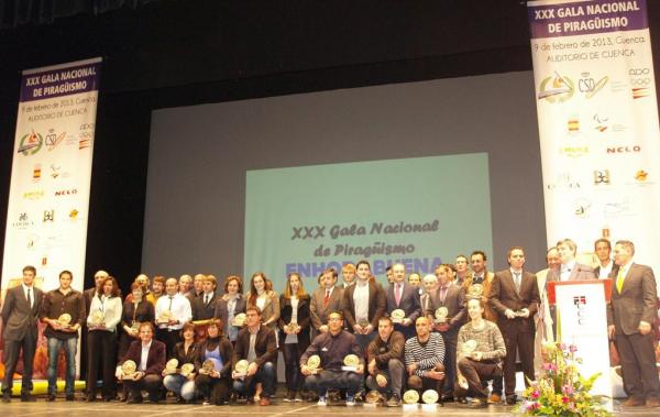 Crónica RFEP 11/02/2013 - La XXX Gala Nacional de Piragüismo se celebró el pasado sábado en el Auditorio de Cuenca, que abrió sus puertas para celebrar los éxitos de los mejores valores del piragüismo de nuestro país. Gracias al Ayuntamiento de Cuenca, que gentilmente cedió sus instalaciones, y a la colaboración del Club Piragüismo Cuenca con Carácter, más de 350 personas entre deportistas, técnicos, árbitros y aficionados pudieron disfrutar de la XXX Gala Nacional de Piragüismo, donde se hicieron entrega de los premios a los ganadores de las ligas nacionales 2012 y también, de los Premios Nacionales del Piragüismo, galardones que reconocen los méritos de los mejores de nuestro deporte el año pasado (si quieres consultar la lista de premiados, pincha aquí). Causó sensación la presencia de cuatro de nuestros representantes olímpicos, tres de ellos medalla en Londres: Alfonso Benavides, Maialen Chourraut, Saúl Craviotto y David Cal, que recibieron los galardones a Mejor Deportista Sub—23, Mejor Deportista Femenino y Mejor Deportista Masculino, respectivamente. Todos coindieron en que ya tenían en mente los Juegos Olímpicos de Río, aunque se mostraron prudentes y convencidos que el trabajo previo debía ser intenso. También estuvieron presente Jesús Morlán, técnico de David Cal, y Xabier Etxaniz, que fueron reconocidos como los mejores técnicos del año 2012, y que quisieron compartir su premio con el resto del equipo técnico presente en los Juegos Olímpicos de Londres. Eva Barrios volvió a repetir como Mejor Deportista Sub—23 femenina por su medalla de oro en el Campeonato del Mundo de Maratón de Roma, aunque reconoció que el próximo año lo iba a tener más complicado para subirse al escenario al ser ya deportista absoluta. Núria Fontané, piragüista de Estilo Libre, ganó el premio a Mejor Piragüista Femenina Júnior, agradeciendo el reconocimiento que suponía el galardón para una de las disciplinas menos conocida del piragüismo. Por su parte, Marcus Cooper Walz, que fue declarado Mejor Piragüista Júnior, ponía el listón alto al afirmar que su lucha de este año iba encaminada a conseguir un oro en alguna de las competiciones internacionales. Estuvo presente también en la Gala José Perurena López, que recibió una Mención Especial por su nombramiento como miembro del Comité Olímpico Internacional. El Presidente de la Federación Internacional de Canoa reinvindicó el papel del piragüismo en los Juegos Olímpicos y su compromiso de intentar que la presencia de este deporte en los Juegos fuera cada vez mayor. Compartió escenario con Susana García Heras, que recibió también una Mención Especial por su papel como Técnico de la Federación Internacional de Canoa; reconocimiento que compartió con Lluís Rabaneda, cuyo trabajo fue igualmente aplaudido aunque no pudo asistir a la Gala. En el apartado de Mejor Árbitro, el galardón cayó en manos de dos personas vinculadas a las especialidades olímpicas de nuestro deporte, uno por su amplia experiencia en el manejo de los medios de control de las llegadas en el ámbito de las aguas tranquilas, y la otra galardonada por su buen hacer como responsable del Comité de Slalom en su labor de realización en las designaciones para las pruebas nacionales: Ignacio Díaz Cela y María Luisa Irigoyen Salaberría. Nelo y Amura recibieron una Mención Especial por su importante labor como co—patrocinadores, cuyo apoyo a nuestro deporte se ha convertido ya en tradicional. Y por la genial cobertura y las retransmisiones desde los canales de Lee Valley y Eton Dorney durante los Juegos Olímpicos, Radio Televisión Española se alzó con el premio al Mejor Medio de Comunicación. Si el Alcalde de Cuenca, Juan Ávila Francés, fue el encargado de abrir el acto con unas palabras llenas de hospitalidad y agradecimiento hacia nuestros deportistas, el Presidente del Consejo Superior de Deportes, Miguel Cardenal Carro, cerró la Gala, poniéndole el broche final a un acto donde el gran protagonista fue, un año más, el mejor piragüismo nacional.