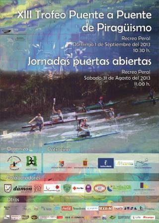 No sin dificultades y a base de trabajo y trabajo, este fin de semana la protagonista será la XIII Competición Puente a Puente de Piragüismo que este año incluye importantes novedades. El Club Piragüismo Cuenca con Carácter, cumpliendo con uno de sus principales objetivos, tiene el gusto de invitar a todos los conquenses a participar activamente en dos eventos planteados y que están incluidos dentro del programa deportivo de ferias y fiestas de San Julián 2013. • 31 de Agosto 10:30h-13:00h. JORNADAS DE PUERTAS ABIERTAS • 1 de Septiembre a partir de las 10:30h. XIII COMPETICIÓN PUENTE A PUENTE DE PIRAGÜISMO Tiene buena pinta, ¿no? Ambos eventos serán posible gracias a la aportación de multitud de colaboradores que se unen a los que ya tradicionalemente nos han venido apoyando ¡Fijáos que cartel! Muchas gracias a todos por vuestra aportación. |