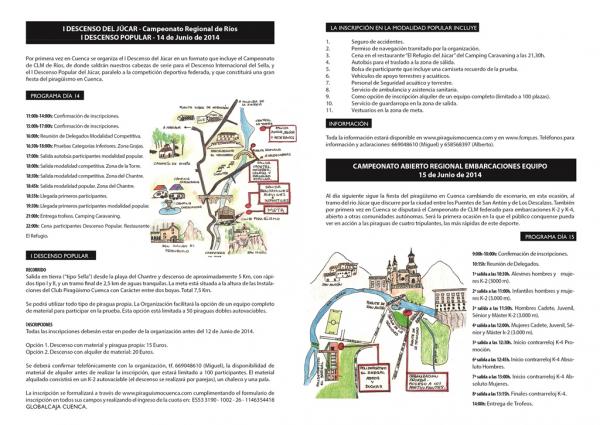 Cerrado el plazo de inscripciones para el Descenso Popular, todavía es posible inscribirse para ocupar las últimas plazas, bien a través de la web a lo largo de hoy, bien presencialmente mañana sábado. El abono de la cuota deberá hacerse en metálico al personal de la organización. Con esto, todo está listo para que el fin de semana planteado por el Club Piragüismo Cuenca con Carácter sea un éxito y siembre un precedente para futuras ediciones. La participación en el Descenso Popular ronda el pleno y para las competiciones federadas se espera una participación cercana a los 200 palistas, por lo que el Júcar estará cubierto de piraguas durante estos dos días. Desde estas líneas queremos animar a todos los conquenses a que se acerquen a la ribera del Júcar a contemplar un deporte que se está convirtiendo en un referente en la capital. Os adjuntamos el programa de mano. También os dejamos el enlace al programa de RTVCM, "Ancha es Castilla", del pasado miércoles, que se retransmitió en directo desde las instalaciones del Club y que muy acertadamente mostró a todos los castellano-manchegos la riqueza natural que nos ofrece el río Júcar a su paso por la capital. ¡Os vemos el fin de semana!