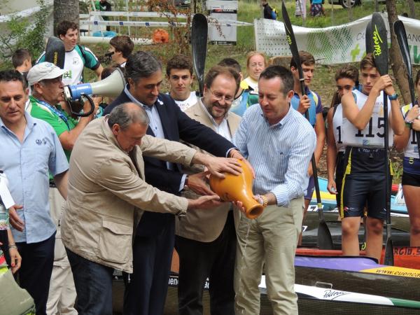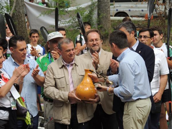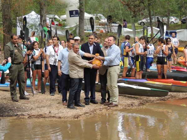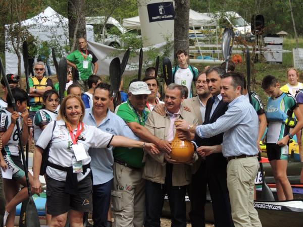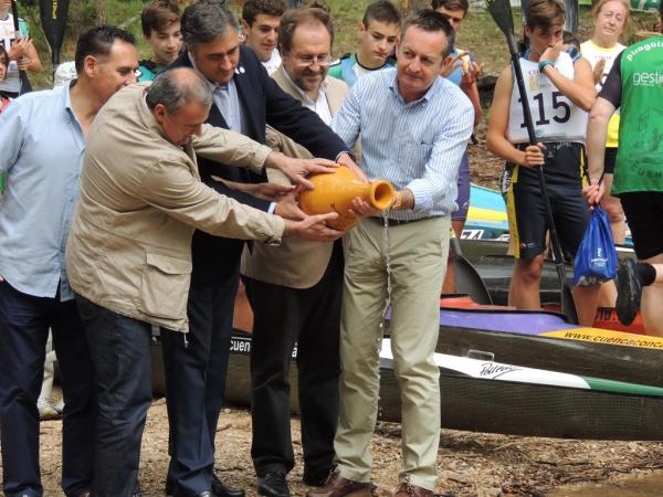 El recién nombrado alcalde de Cuenca, Ángel Mariscal, el vicepresidente de la Diputación Provincial de Cuenca, Julián Huete, el alcalde de Parres (Arriondas), Emilio García Longo, el presidente del Comité Organizador del Descenso Internacional del Sella, José Antonio Modino, el presidente de la Real Federación Española de Piragüismo, Juan José Román, y la vicepresidenta del Club Piragüismo Cuenca, Maite Espinilla, sellaron la primera parte del hermanamiento entre los ríos Júcar y Sella aprovechando la celebración del II Descenso del Júcar-Trofeo Quixote. El acto fue realizado en el paraje del Chantre a las 12,00h, momentos previos a la segunda salida de la modalidad competitiva y del descenso popular. Recordamos que el hermanamiento se consumará el día 7 de Agosto en Asturias, en el río Sella. Y es que este año el 79º Descenso Internacional del Sella se dedica a la Ciudad de Cuenca, premiando la labor de promoción y difusión del piragüismo que está haciendo el Club Piragüismo Cuenca con Carácter que siguen cosechando éxitos por todo el territorio nacional. Os dejamos el enlace al vídeo elaborado por el periódico digital deportivo Eldeporteconquense. En breve la crónica oficial del II Descenso del Júcar: http://eldeporteconquense.com/multimedia-videos/2015/06/15/el-video-del-trofeo-quixote-2015/