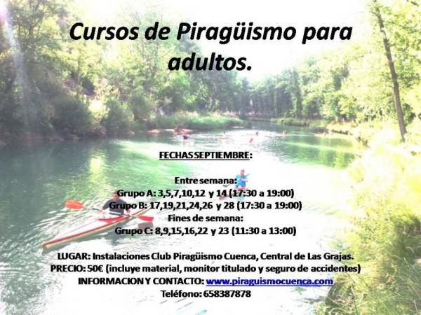 El Club Piragüismo Cuenca con Carácter convoca tres nuevos cursos de iniciación para adultos para el próximo mes de septiembre Se convocan tres curos de iniciación para adultos en las instalaciones del Club, sujetos a un mínimo de 6 inscripciones por curso y un máximo de 12. El precio por curso será de 50 euros en el que se incluye el material, el monitor titulado y el seguro de accidentes. Cursos: Grupo A: días 3,5,7,10,12, y 15 (17,30h-19,00h) Grupo B: días 17,19,21,24,26 y 28 (17,30h-19,00h) Grupo C (fines de semana): 8,9,15,16,22 y 23 (11,30h-13,00h) Teléfono de información e inscripciones: 658387878 (Enrique). Se adjunta ficha de inscripción. |